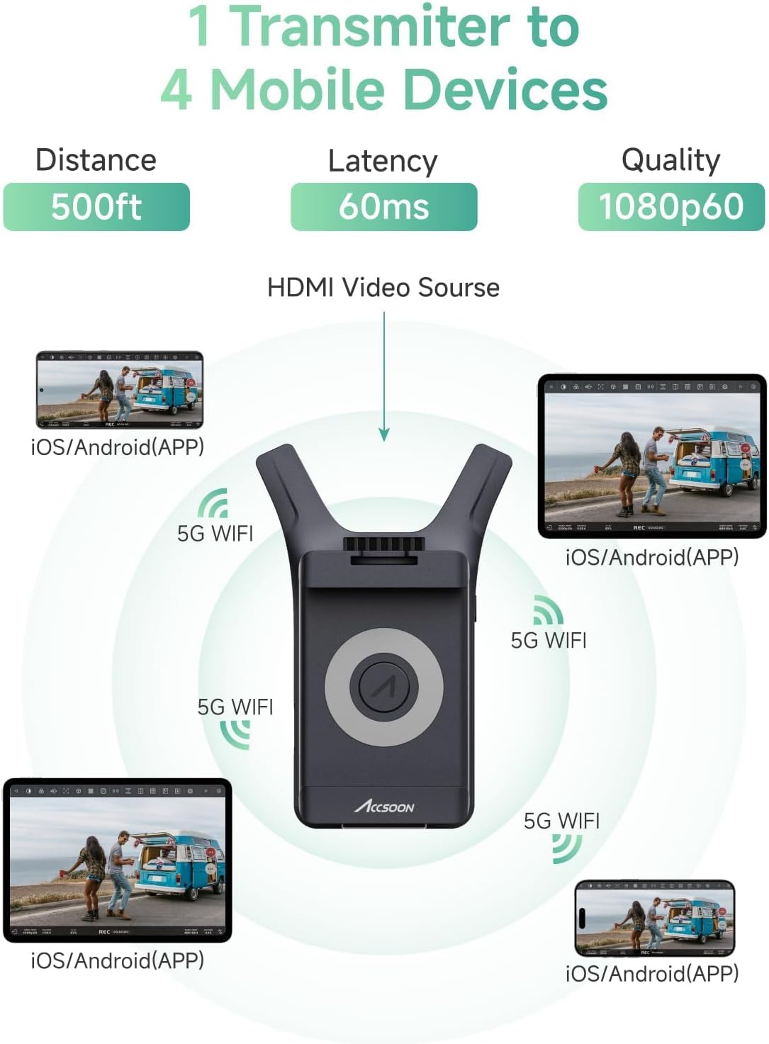 Accsoon CineView Nano 5G Transmisor Inalámbrico de Vídeo FHD HDMI 1080P 60FPS, 4 Dispositivos Móviles para Monitorización, Latencia de 60ms y Alcance de 500FT/150M, Diseño de Liberación Rápida