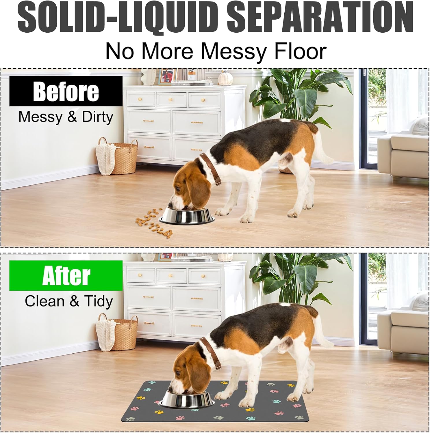 3. Esta Tapete para Comer Perros y Gatos Impermeable y Antideslizante evita que el suelo se ensucie con agua y restos de pienso. El uso de nuestra tapete para comer perros mantiene sus suelos limpios y secos, ahorrándole tiempo en fregar y limpiar.