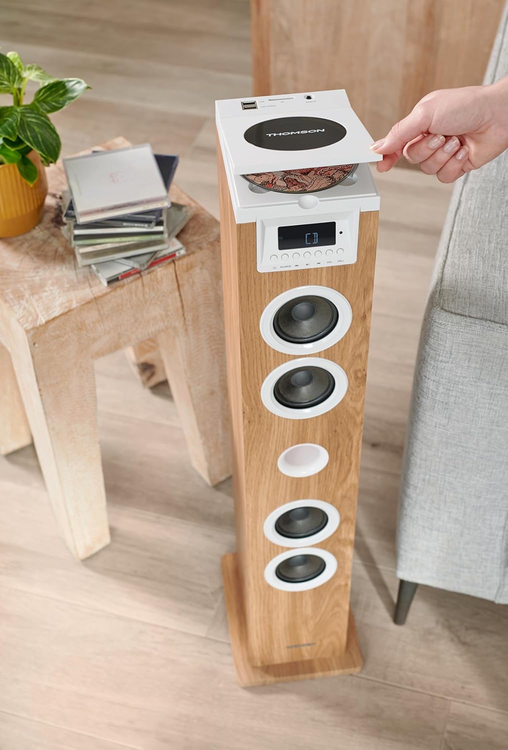 Altoparlante a torre – THOMSON – Bluetooth/CD/USB/SD – Bianco/Legno – 60W – Radio FM