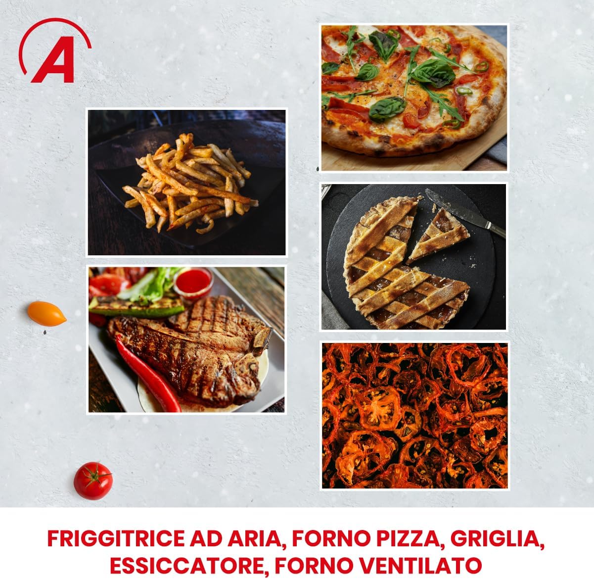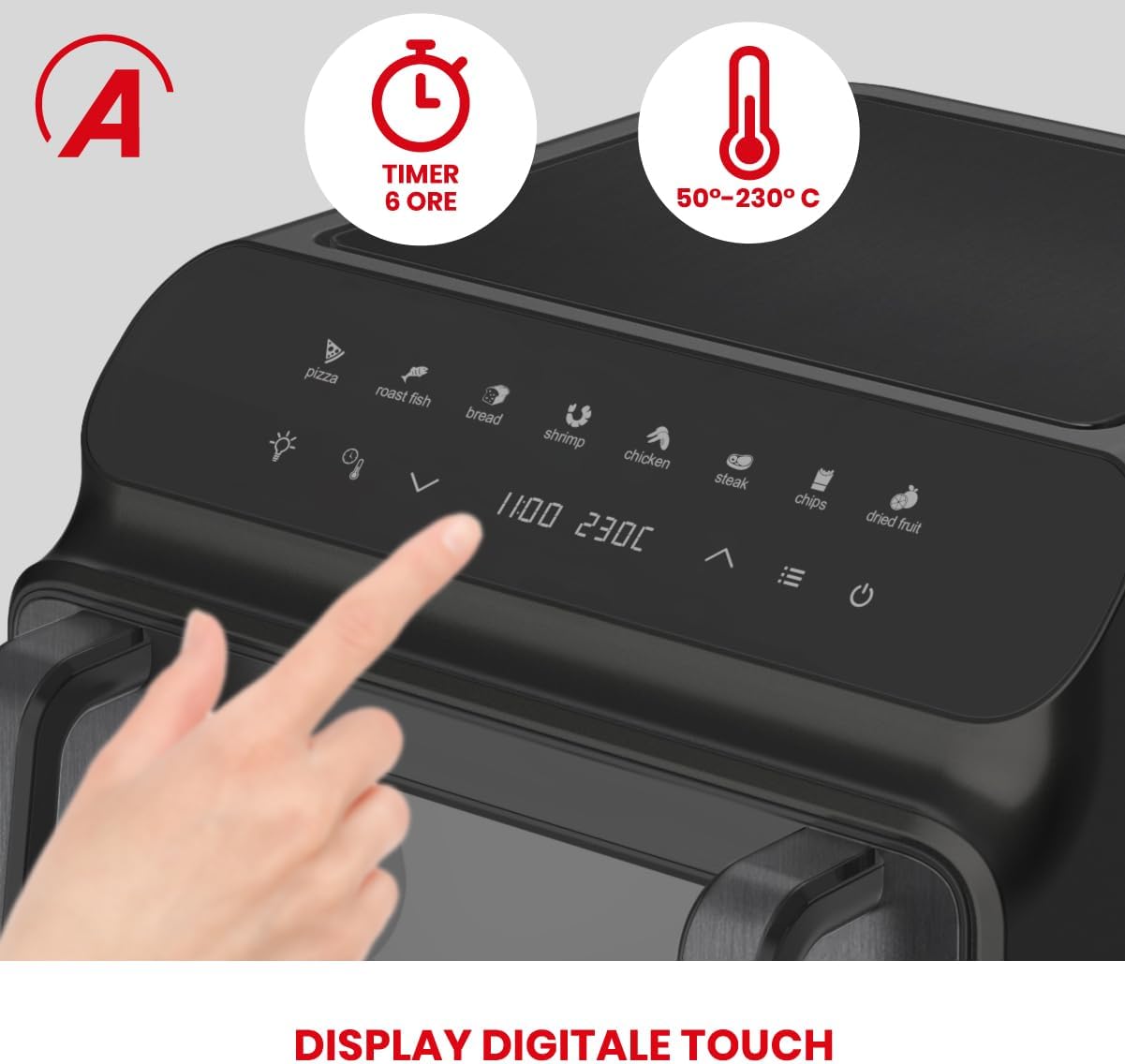 Modo de cocción: la freidora grill es capaz de cocinar pizzas, asar, tostar, deshidratar y freír al aire; gracias a la doble resistencia, inferior y superior, el rendimiento de cocción mejorará significativamente sin necesidad de sacudir la comida. 8 programas preestablecidos disponibles: pan, pizza, pescado, mariscos, parrilla, pollo, patatas fritas, deshidratador.