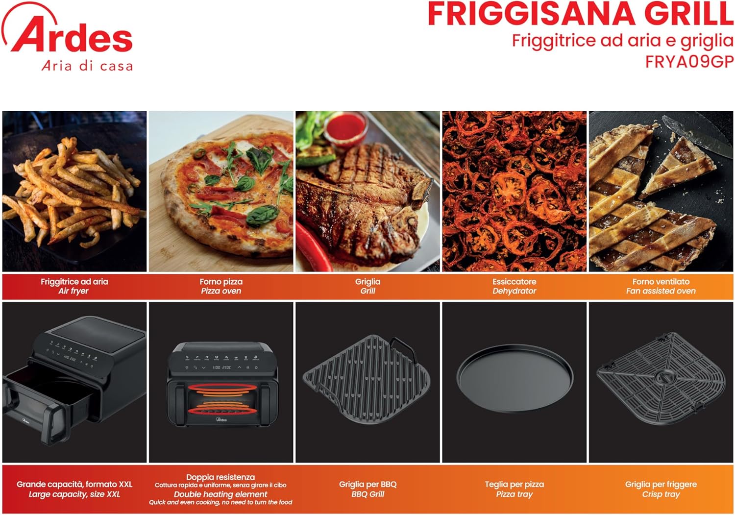 Ardes ARFRYA09GP FRIGGISANA GRILL Capacidad 10 litros XXL Freidora de aire y parrilla BBQ con doble resistencia gran ventana y luz interior horno multifunción con pantalla digital y