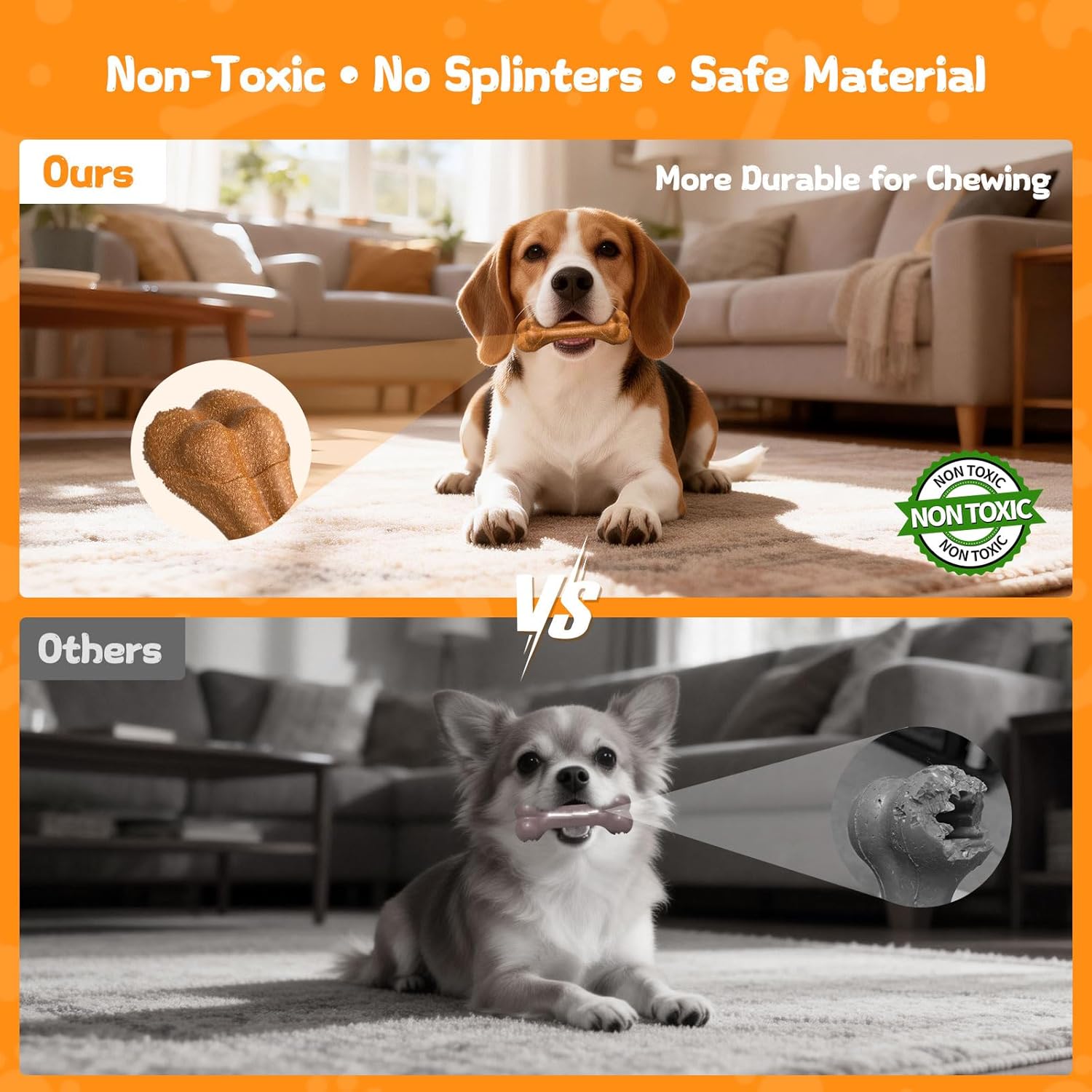 Nuestro hueso masticable bronceado soluciona esto, mezclando materiales inteligentes para ambos. Hecho de 15% fibra de madera + 85% polipropileno duradero, no es tóxico, resiste mandíbulas fuertes y dura más que el plástico endeble. Infundido con un 0,1% de aroma de carne de res real, aprovecha los instintos naturales de masticación, mantiene a los cachorros entretenidos y redirige la energía de tus muebles. Su superficie sutilmente texturizada limpia los dientes, corta la placa para un aliento más fresco.