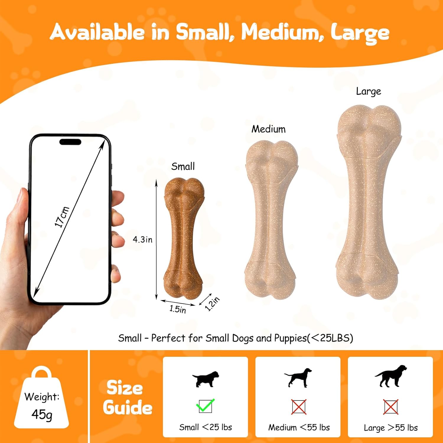 Material duradero y natural: hecho de una innovadora mezcla de 15% fibra de madera y 85% material de polipropileno duradero, este hueso masticable para perros está diseñado para durar. Su textura realista y color bronceado imitan un hueso real, satisfaciendo perfectamente los instintos naturales de masticación de tu perro de una manera segura y sostenible