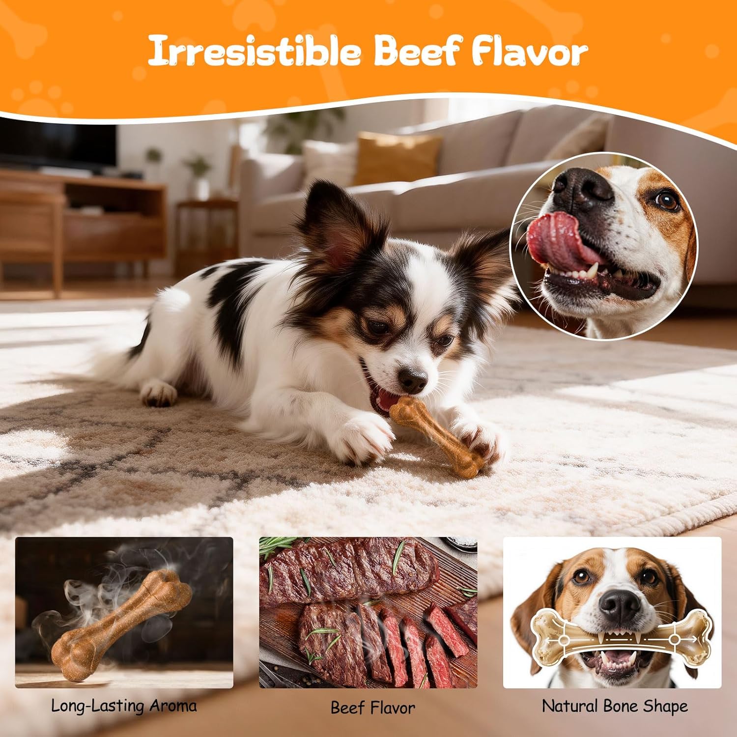 Sabor irresistible de carne de vaca: impregnado con un sutil aroma de carne de res real al 0,1 %, este juguete masticable para perros es muy atractivo para tu perro. Fomenta hábitos de masticación saludables y proporciona estimulación mental, manteniéndolos entretenidos durante horas