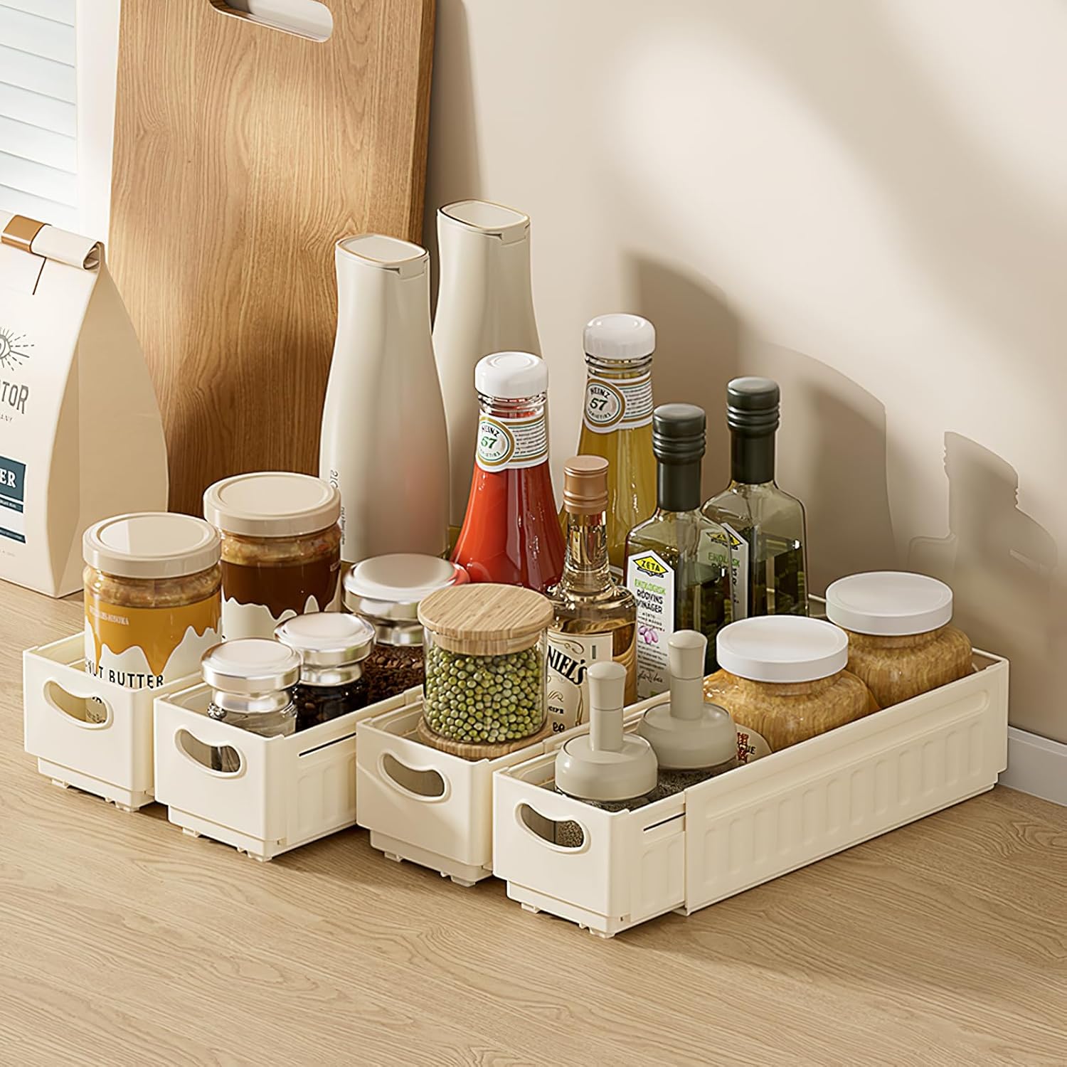 Cajas De Almacenamiento Para Cocina: Juego de 3 cajas de almacenamiento de plástico apilables, cada caja de plástico es retráctil y las dimensiones de la longitud retráctil son 28-48 cm/11-18,8 pulgadas, el ancho es 10 cm/3,9 pulgadas y la altura es 8 cm/3,14 pulgadas