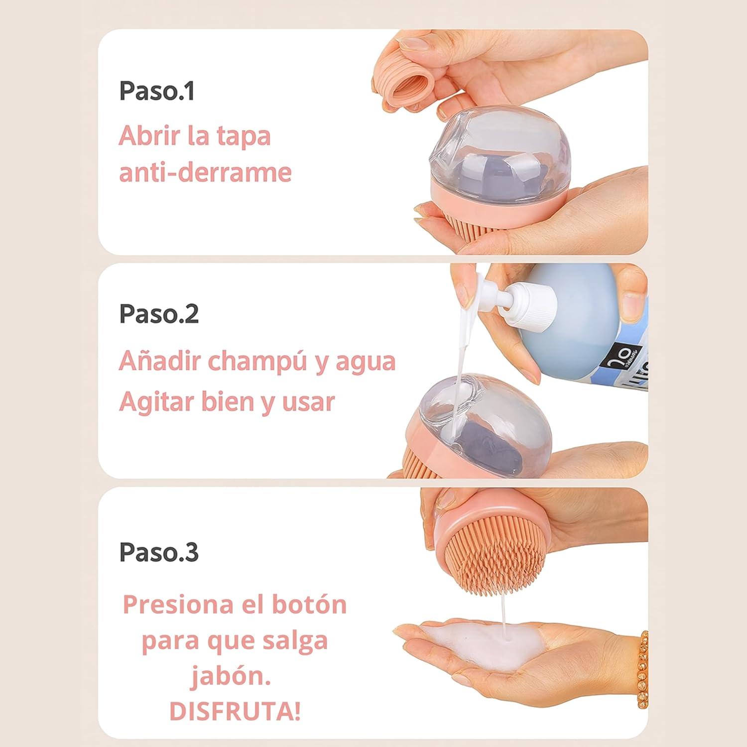 🧼 CEPILLO DE BAÑO CON DISPENSADOR: Perfecto para aplicar champú o jabón mientras cepillas. Su diseño ergonómico sirve tanto para perros y gatos como para uso personal (humano).
