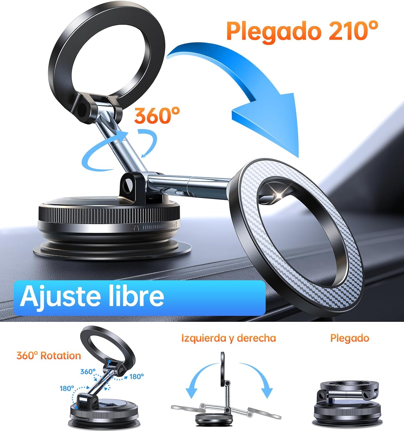 【Ajustable 360° – Vista perfecta, Cero balanceo】- Con una cabeza giratoria de 360° y un brazo plegable de doble eje de 210° en aleación de zinc, coloca tu teléfono vertical u horizontalmente para GPS, llamadas o música. Este soporte para teléfono de coche permanece completamente estable, incluso en caminos con baches. No más distracciones: solo conducción segura y manos libres.