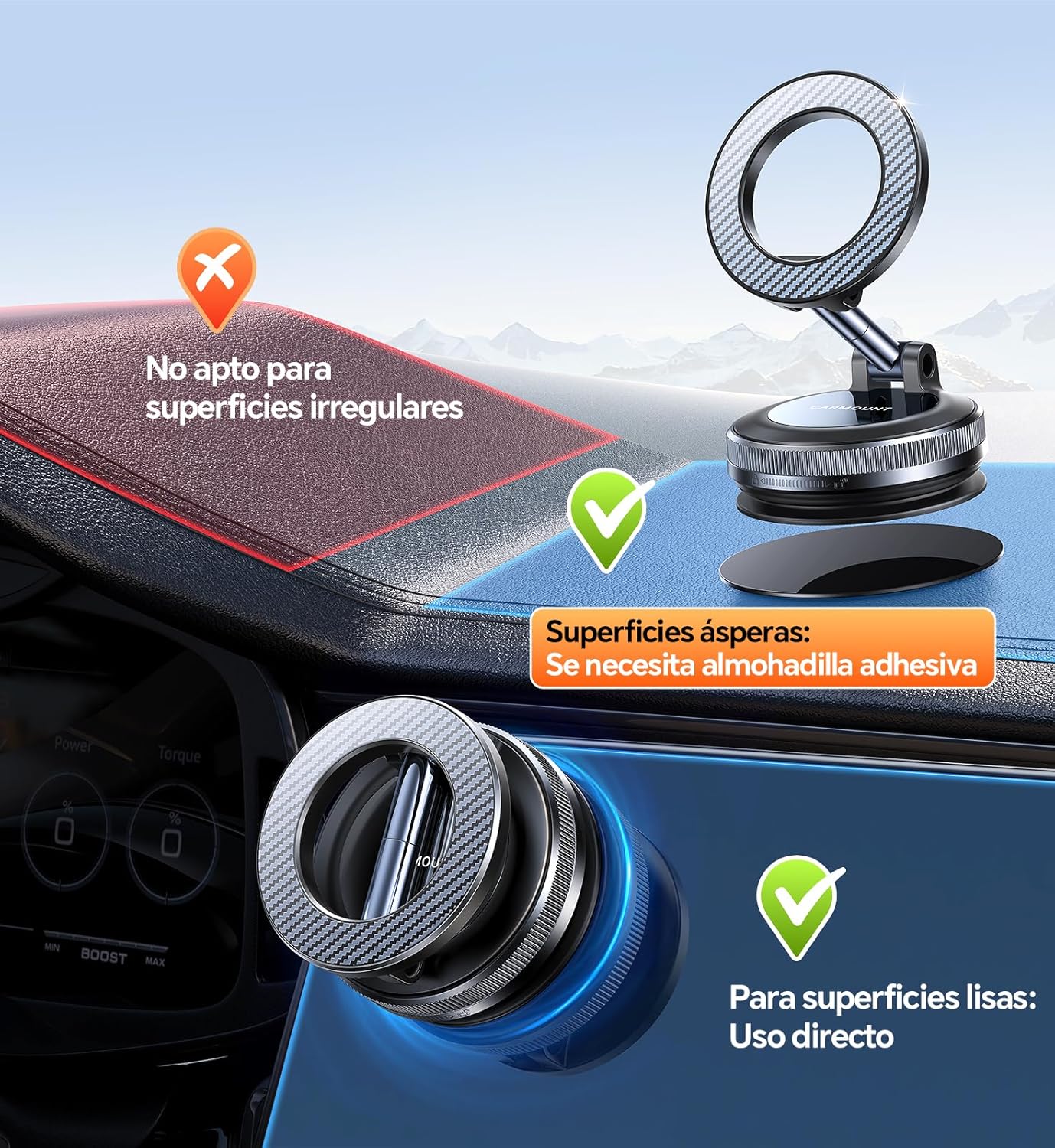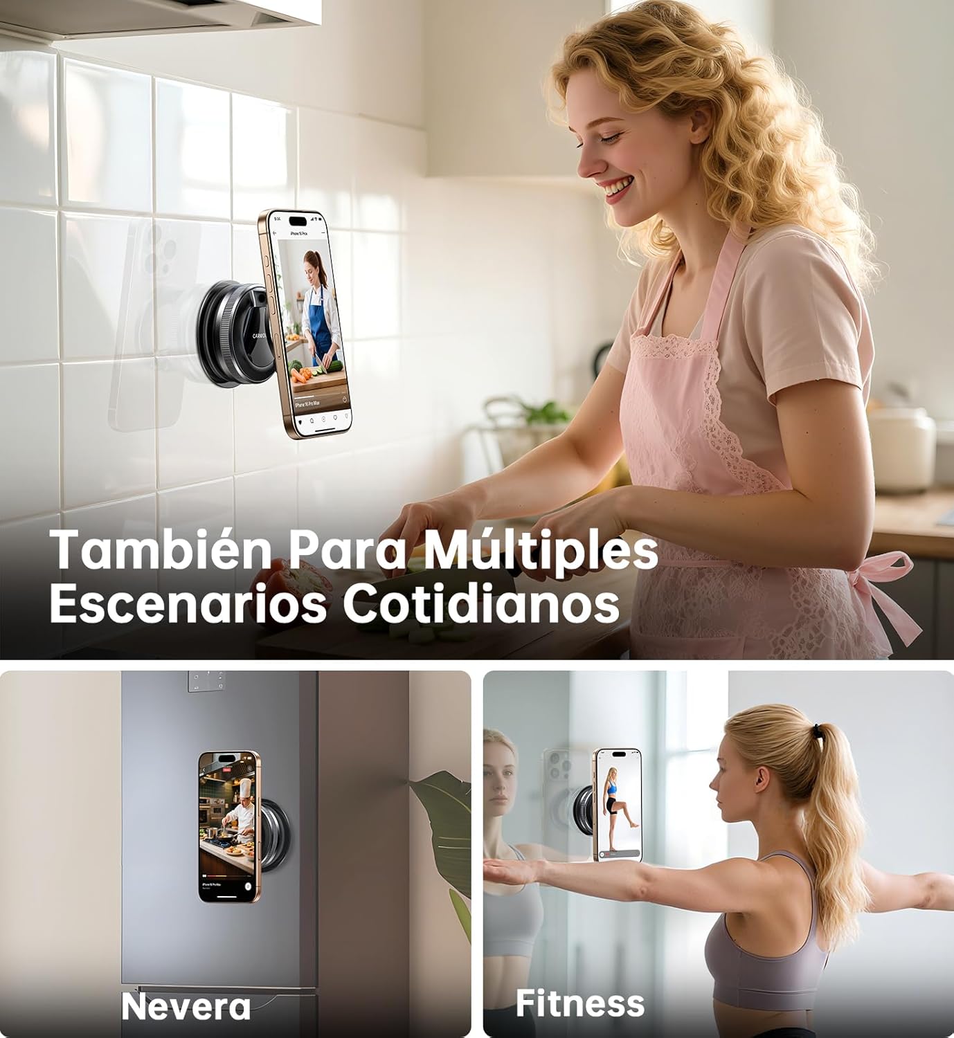 【Tu soporte magnético para teléfono para llevar a cualquier parte】- Este soporte para teléfono combina una potente succión al vacío y un agarre magnético ultra fuerte para funcionar prácticamente en cualquier lugar. Se instala sin esfuerzo en salpicaderos de coche (incluido vinilo texturizado), parabrisas, superficies de vidrio, espejos, azulejos, madera pulida, mármol y la mayoría de acabados lisos o semibrillantes, para que puedas asegurar tu teléfono en el coche, cocina, gimnasio, baño o incluso al grabar contenido. Una almohadilla adhesiva incluida extiende la compatibilidad a superficies irregulares. Perfecto para conducir, cocinar, entrenar o crear contenido manos libres.