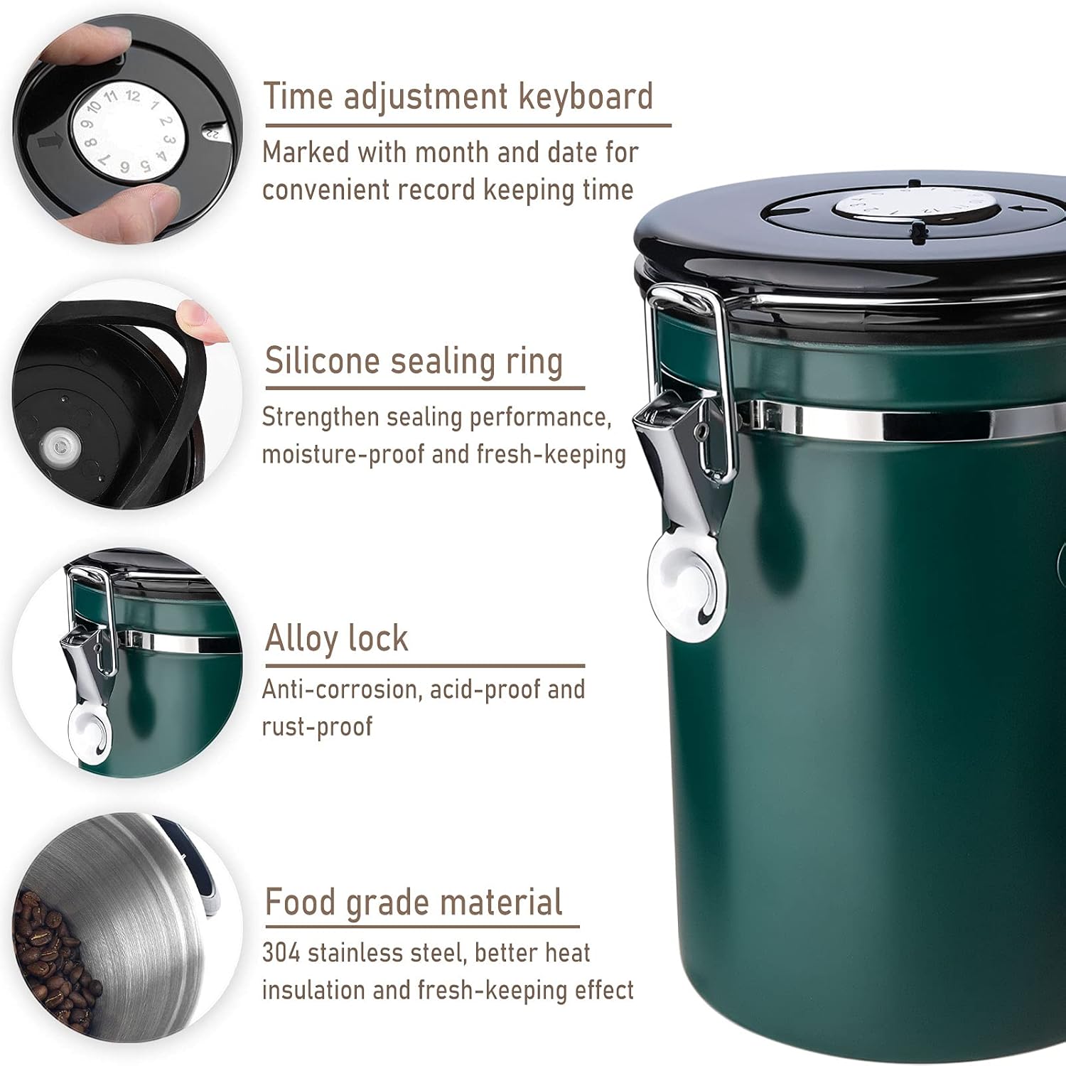 Recipiente hermético para café Frasheng: disfrute de café fresco en cualquier momento. Nuestra lata de café Frasheng, con su diseño delgado y moderno de acero inoxidable, se puede exhibir en una encimera o guardar en un armario o despensa. Capacidad: 1,8 L. Material: Acero inoxidable. Color: Verde. Almacenamiento de alta calidad. 100% sellado, se mantiene fresco durante mucho tiempo y conserva el aroma de los granos de café. El aroma de los granos de café expuestos al aire se evapora rápidamente y se vuelve fácilmente perecedero. Multifuncional: no solo para almacenar granos de café, sino también té, azúcar, cacao, cereales, avena, etc. También es un regalo ideal para amigos y familiares. Revestimiento de acero inoxidable. Manténgase fresco durante mucho tiempo, diseño moderno, sin óxido, Bpa. Si lo usa para almacenar azúcar, sal, harina, pasta, pasteles, té y otros alimentos, también puede permanecer fresco por más tiempo. Mantenga el café fresco por más tiempo, los granos de café liberan dióxido de carbono de forma natural. Sin embargo, este Co2 daña la frescura del café y permite que los granos pierdan su aroma más rápido. La válvula única de nuestro bote de café libera el CO2 sin dejar entrar aire ni humedad. Brújula de tiempo, registre el tiempo y realice un seguimiento de la frescura de los ingredientes, registre la fecha de caducidad del grano de café. Lista de paquetes: 1 lata de café, 1 cuchara medidora
