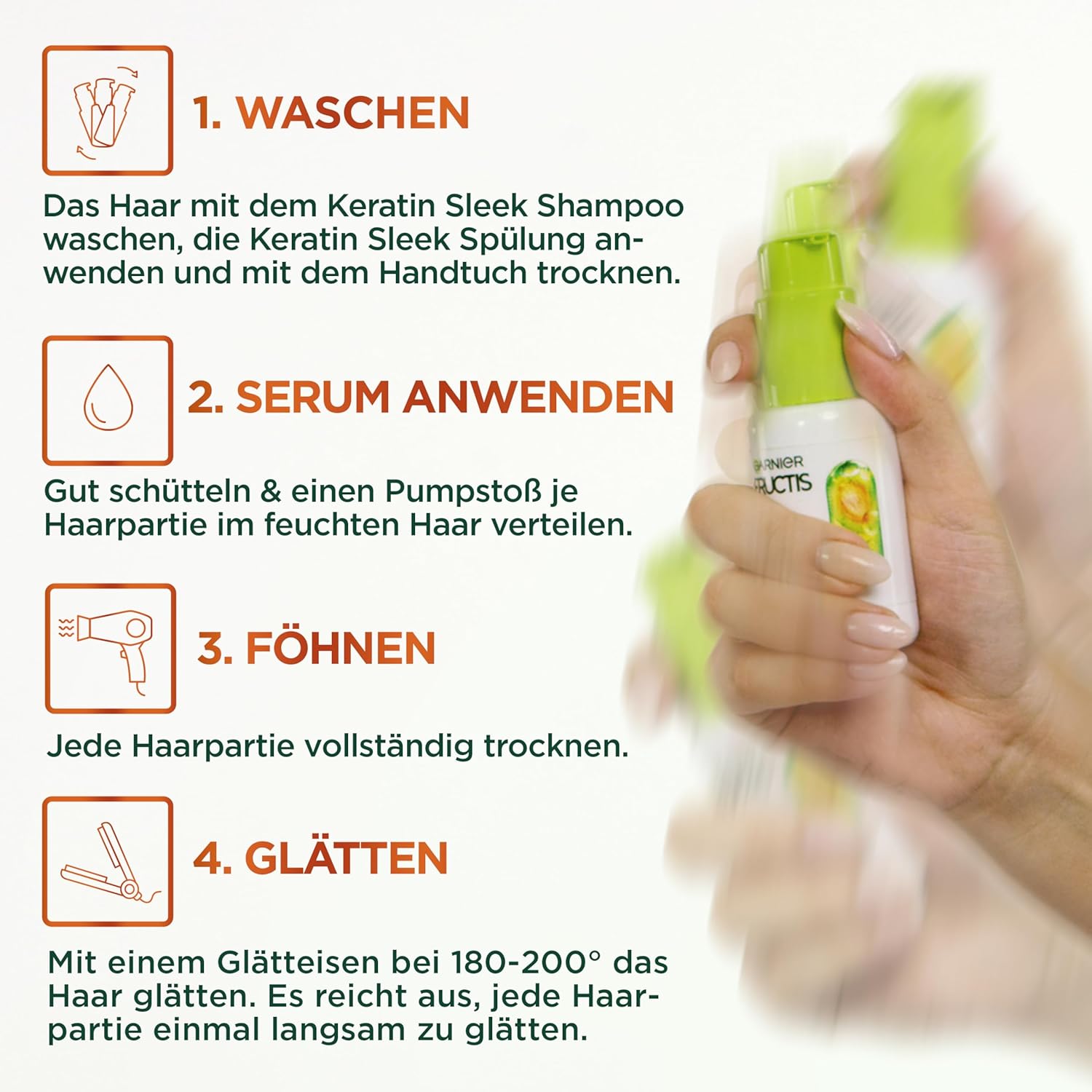 El serum activado por calor Fructis Sleek & Stay es parte de la serie Garnier para el cuidado del cabello, que consiste en champú, acondicionador, máscara y suero para el cabello, especialmente adaptado a las necesidades de cabello seco y propenso al frizz. Para ello, el sérum Leave-in contiene alfa-silanos que se colocan alrededor de la fibra capilar en un escudo tan pronto como se activa por el calor. Esto no solo contrarresta el encrespamiento, sino que el cabello se alisa y obtiene un brillo saludable – hasta cinco lavados de pelo de largo. La protección contra el calor resistente al agua es ideal para una aplicación antes de secar o alisar. Para un cuidado aún más suave, se recomienda utilizar champú, acondicionador y mascarilla capilar de la serie de cuidado para darle al cabello aún más brillo, suavidad y suavizado.