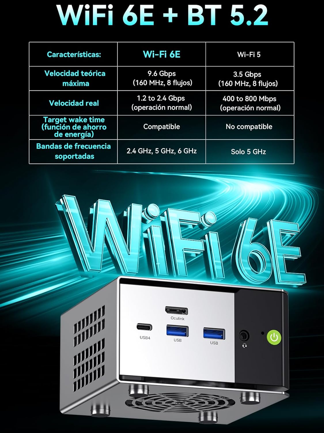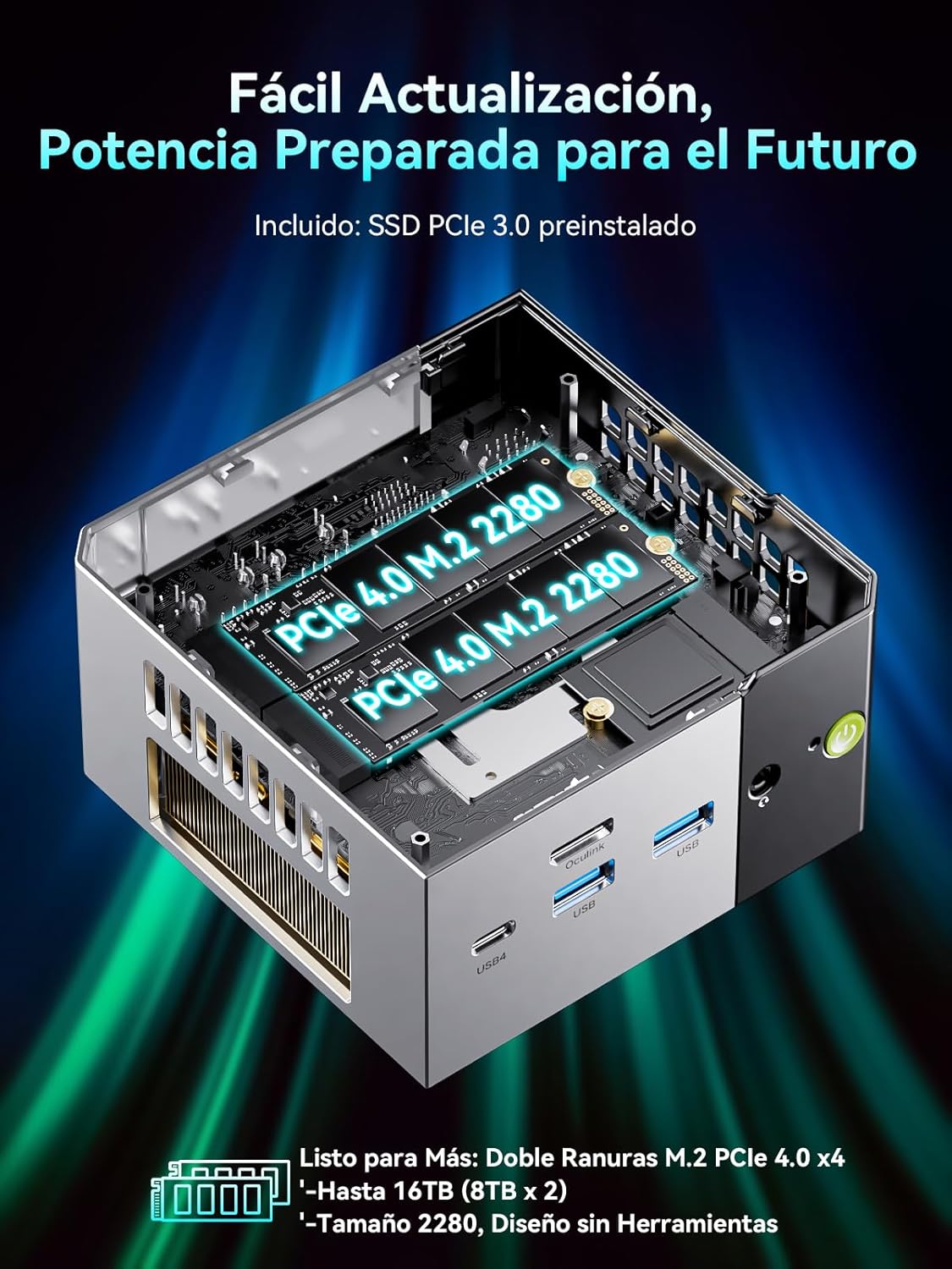 PUERTO OCULINK – El puerto Oculink del M8 Mini PC ofrece mayor ancho de banda, mejores tasas de fotogramas y menor latencia. El estándar opera a velocidades PCIe x4, en comparación con el x3 de Thunderbolt. Los jugadores y creadores de contenido pueden beneficiarse del mayor ancho de banda de OCuLink, obteniendo mejor rendimiento y menor latencia en configuraciones eGPU.