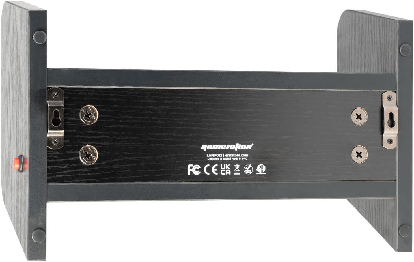 Lámpara inspirada en la parte superior de las máquinas arcade. Está hecho de MDF y acrilato. Incluye un modo de iluminación con un solo botón de control situado en el lateral de la lámpara. Tiene dos anclajes en la parte posterior para colgar fácilmente y las paredes laterales están ligeramente elevadas por lo que se puede utilizar como estante. Funciona con un cable USB tipo C – Entrada 5V DC 1A (incluido) y, además, dispone de una batería interna recargable Li-ion 2000mAh 3.7V con una autonomía de 6 horas y un tiempo máximo de carga de 3 horas 30 minutos. Incluye dos tapones y dos tornillos para la instalación. Dimensiones: 34 x 22,5 x 14 cm.