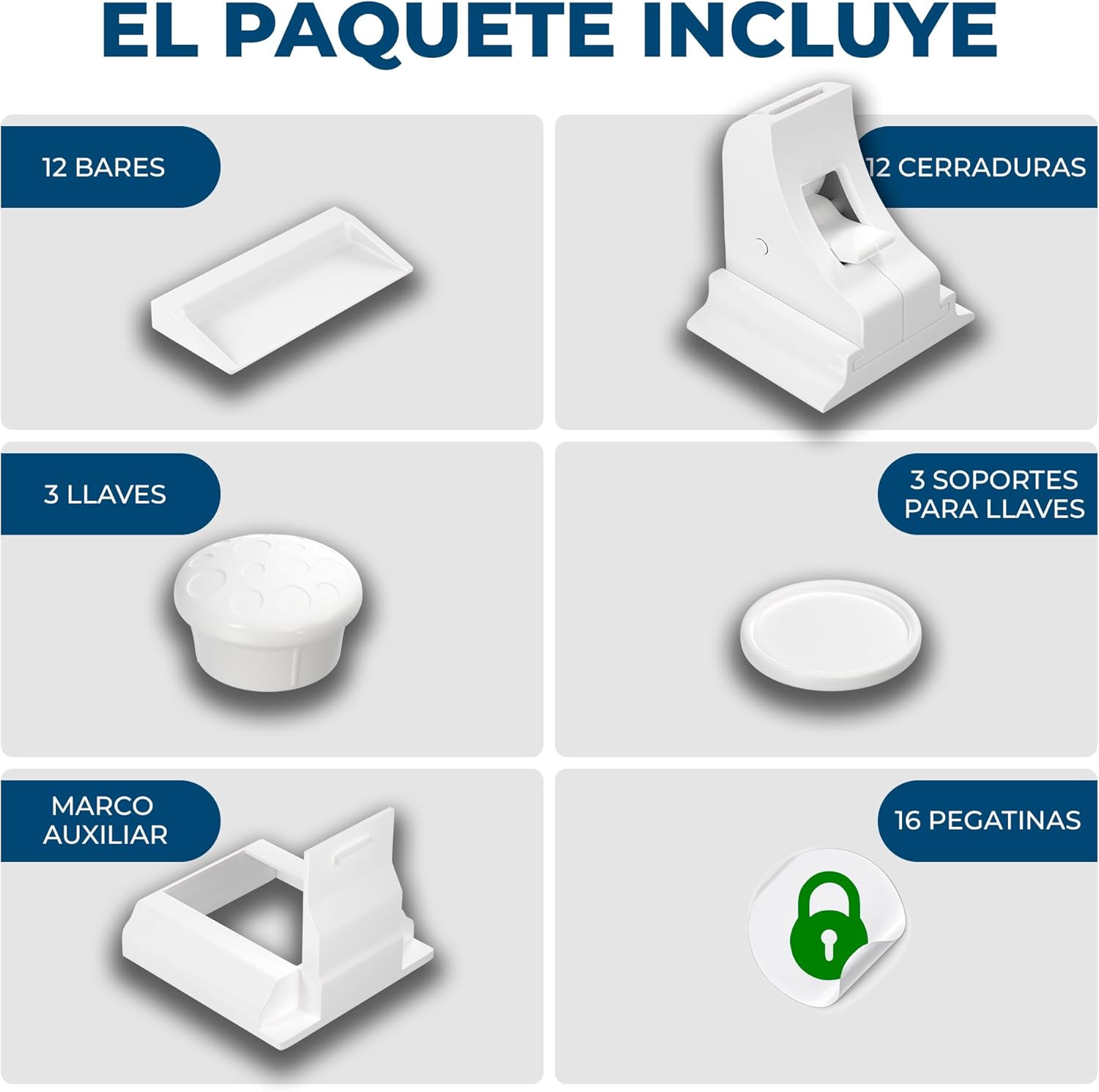 El juego consta de 12 cerraduras + 12 cerrojos + ayuda para la instalación + 3 llaves + 3 llaveros + 16 pegatinas