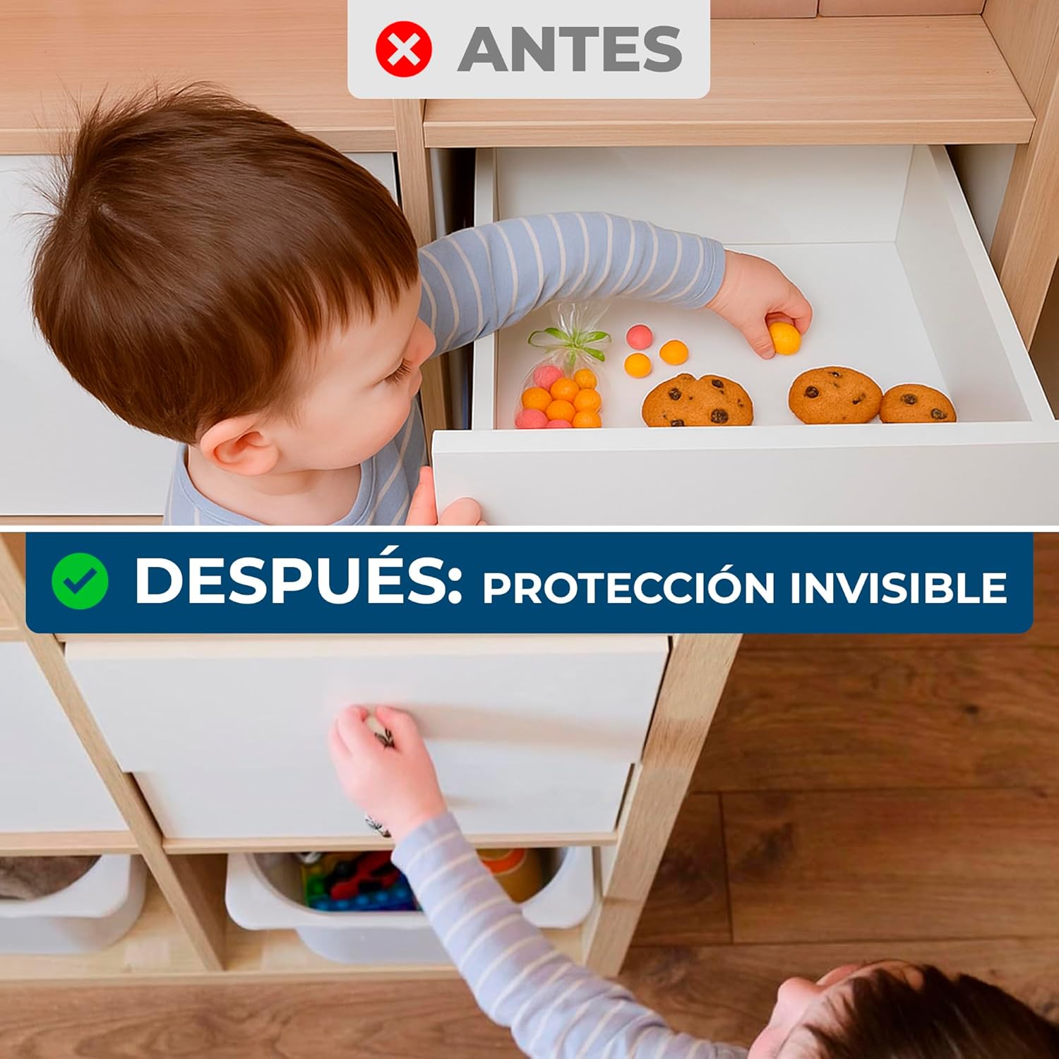 Protección invisible | Mantén tus muebles impecables: la cerradura magnética permanece desapercibida para tus hijos y tus invitados. Su diseño oculto protege de sustancias químicas, objetos afilados y piezas pequeñas que pueden ser ingeridas, sin alterar el aspecto de tus muebles.