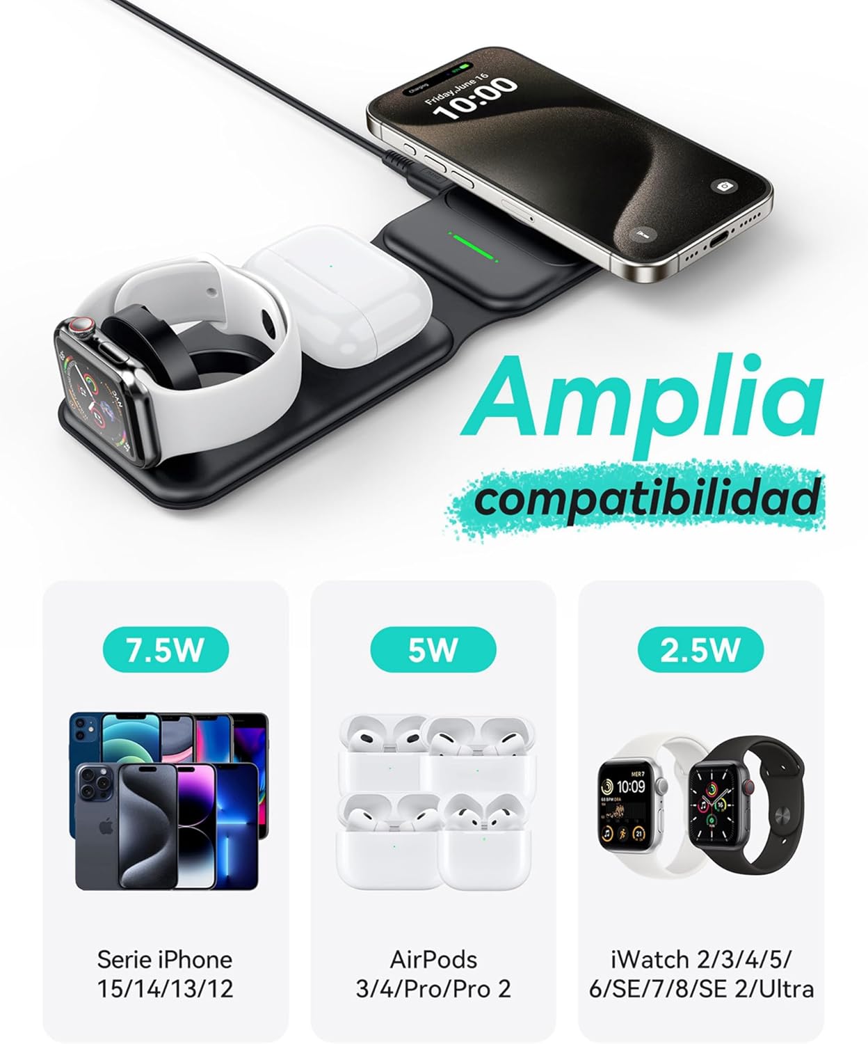 [La mejor opción para usuarios de múltiples dispositivos] Obtén el cargador inalámbrico magnético plegable 3 en 1 para cargar tu teléfono, auriculares y reloj inteligente al mismo tiempo. Solución portátil y que ahorra tiempo.