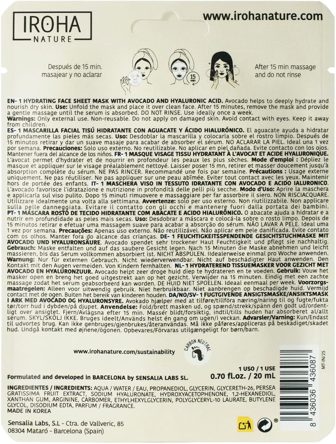 Iroha Nature – Mascarilla Facial Hidratante con Aguacate y Ácido Hialurónico | Nutrición Profunda Todo Tipo de Piel | Resultados en 15 Minutos | 100% Vegana y Cruelty-Free