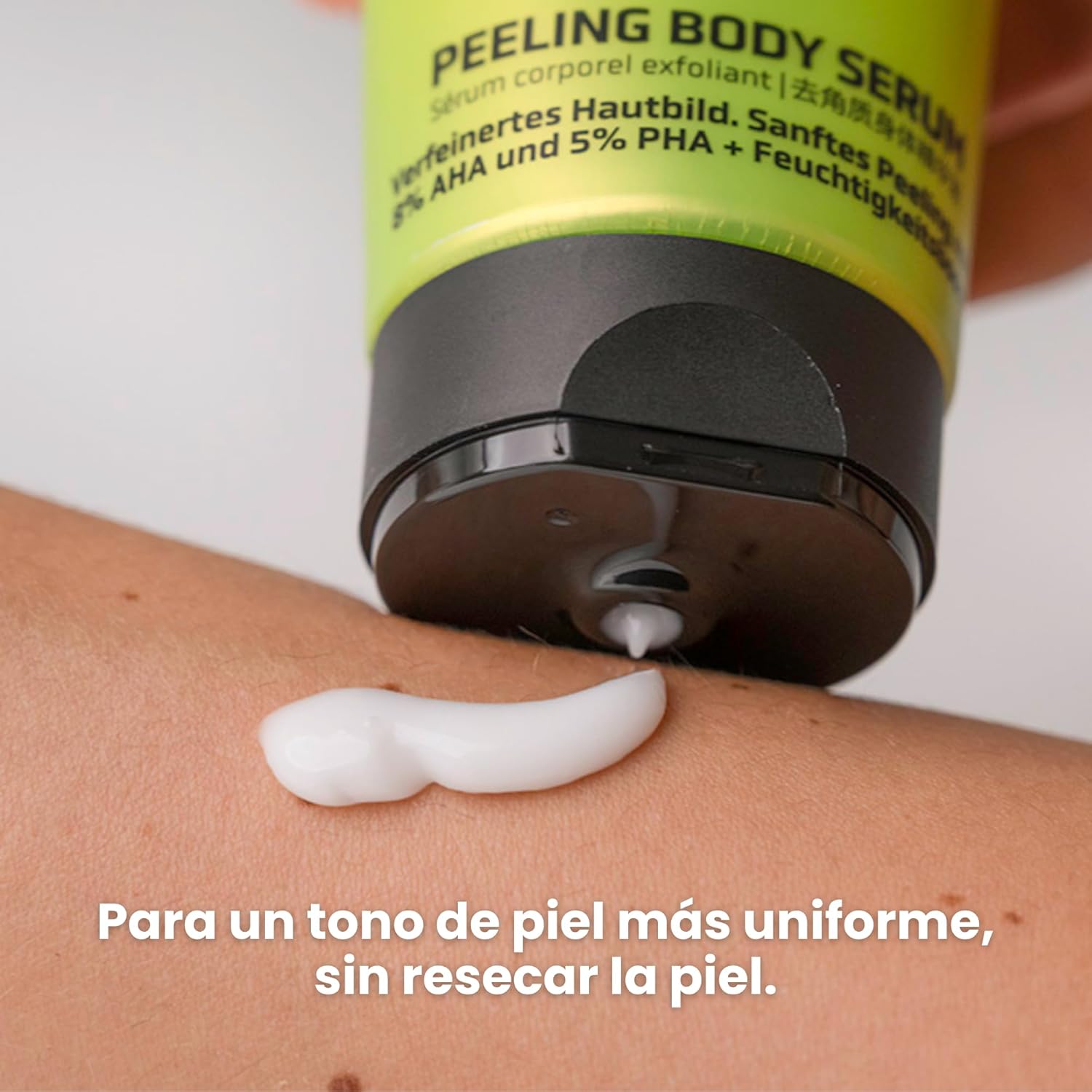 Nuestro Suero Corporal AHA & PHA combina el efecto de un peeling químico para el cuerpo con la sensación calmante de una crema
