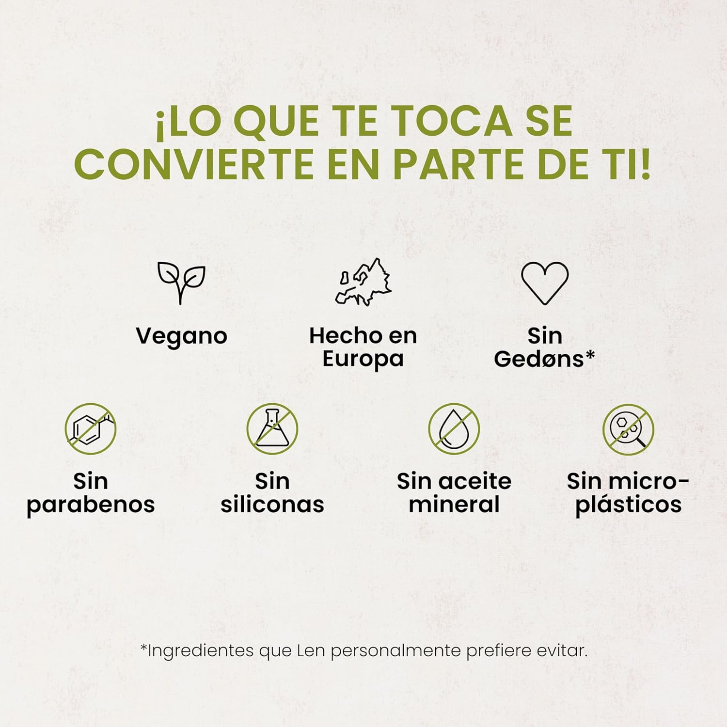 - Sin ingredientes de origen animal, parabenos, siliconas, microplásticos & aceite mineral