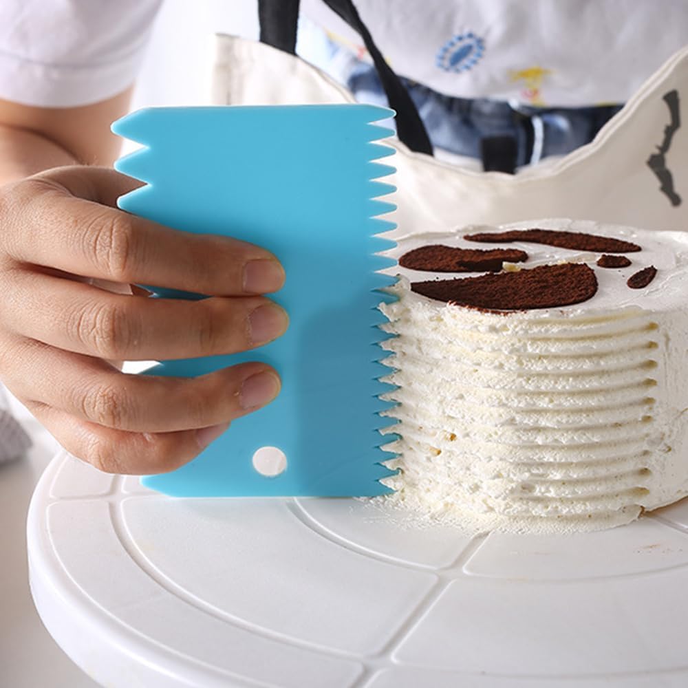 Fácil de limpiar: los peines para tartas son muy fáciles de limpiar, se pueden limpiar con agua tibia o lavar en el lavavajillas, simplemente evita que se sequen a la sombra después del lavado. Equipado con un agujero, es conveniente colgar el raspador para guardarlo.