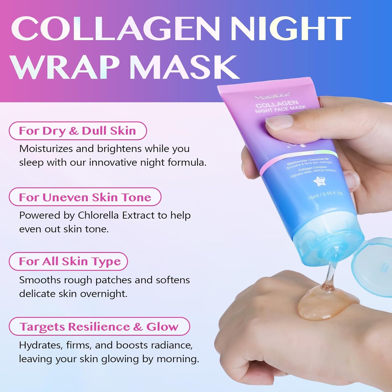 Mascarilla envolvente nocturna de colágeno, mascarilla facial despegable: cuidado de elasticidad e hidratación, reafirmante y brillante: mascarilla de colágeno de noche para una piel radiante, 2.53 fl. OZ con aplicador de mascarilla.