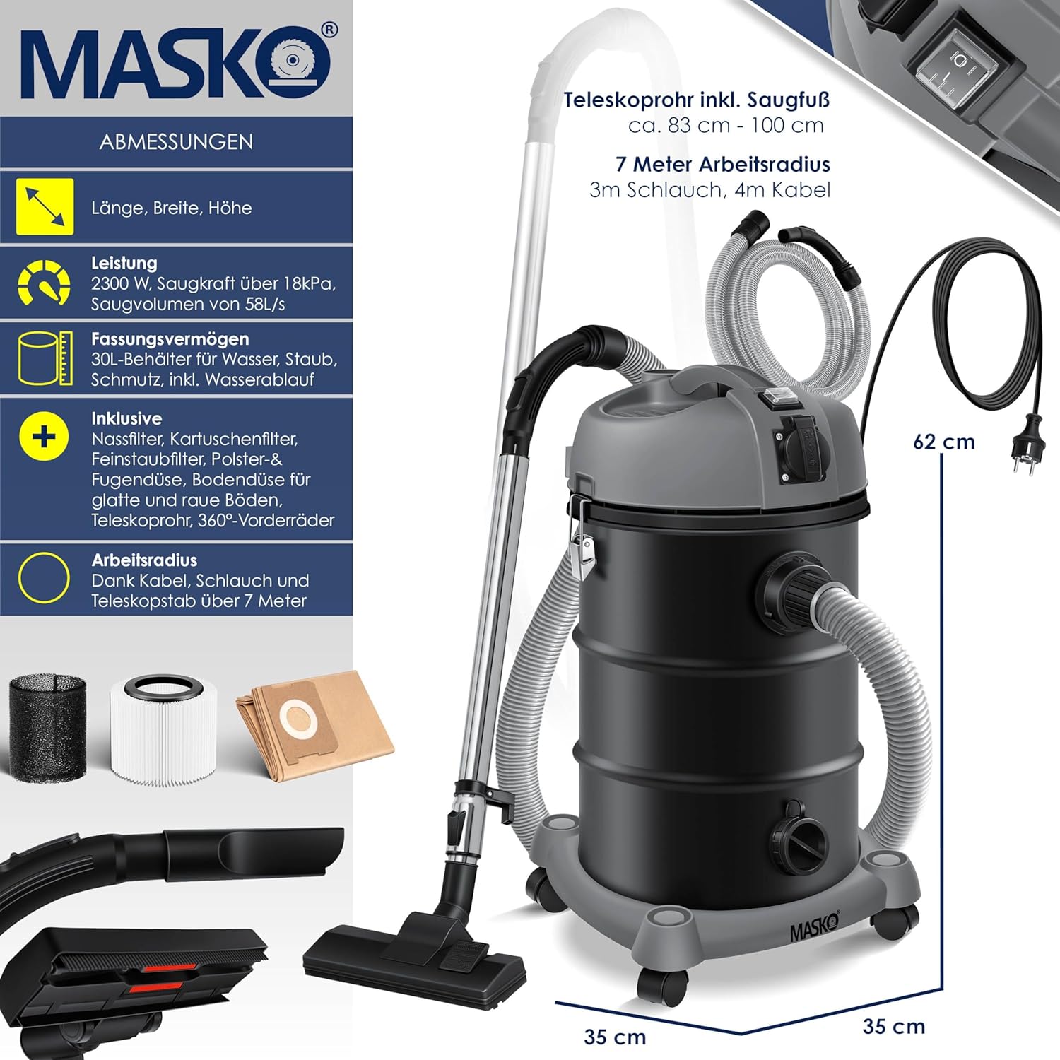 MASKO Aspirador Industrial 6 en 1 – 2300 W – Con enchufe – Función de soplado – Aspirador en seco y húmedo