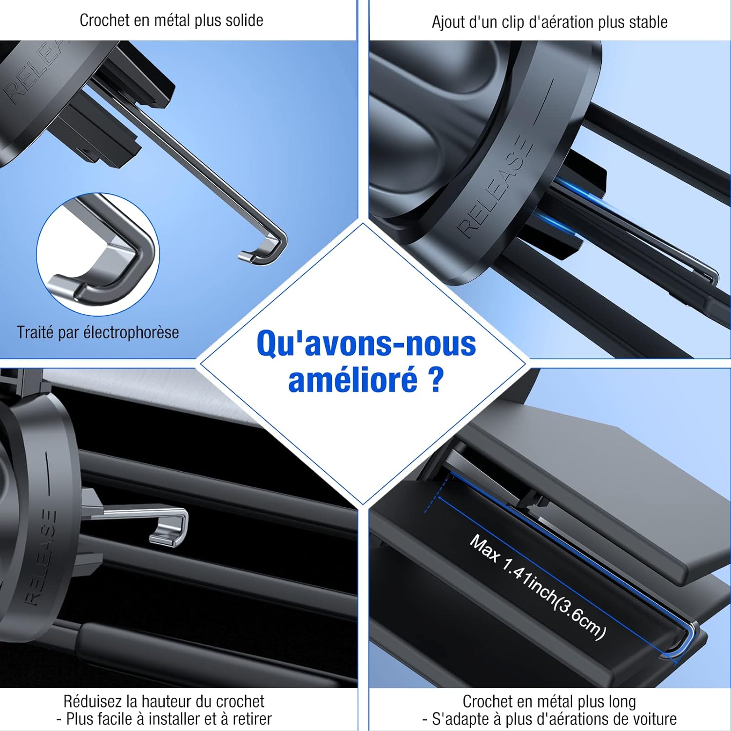 【Nunca se Caiga】 Mejoramos enormemente soporte coche movil el soporte del teléfono del automóvil en función de los comentarios de más de 100,000 clientes. El material del gancho de clip de ventilación se actualizó al metal; mejoró su estructura para que este soporte para teléfono de automóvil pueda compatible con la mayoría de los automóviles firmemente. Mientras tanto, podría funcionar mejor incluso en entornos extremos. [Atención: diseñado para ventilación horizontal y vertical]