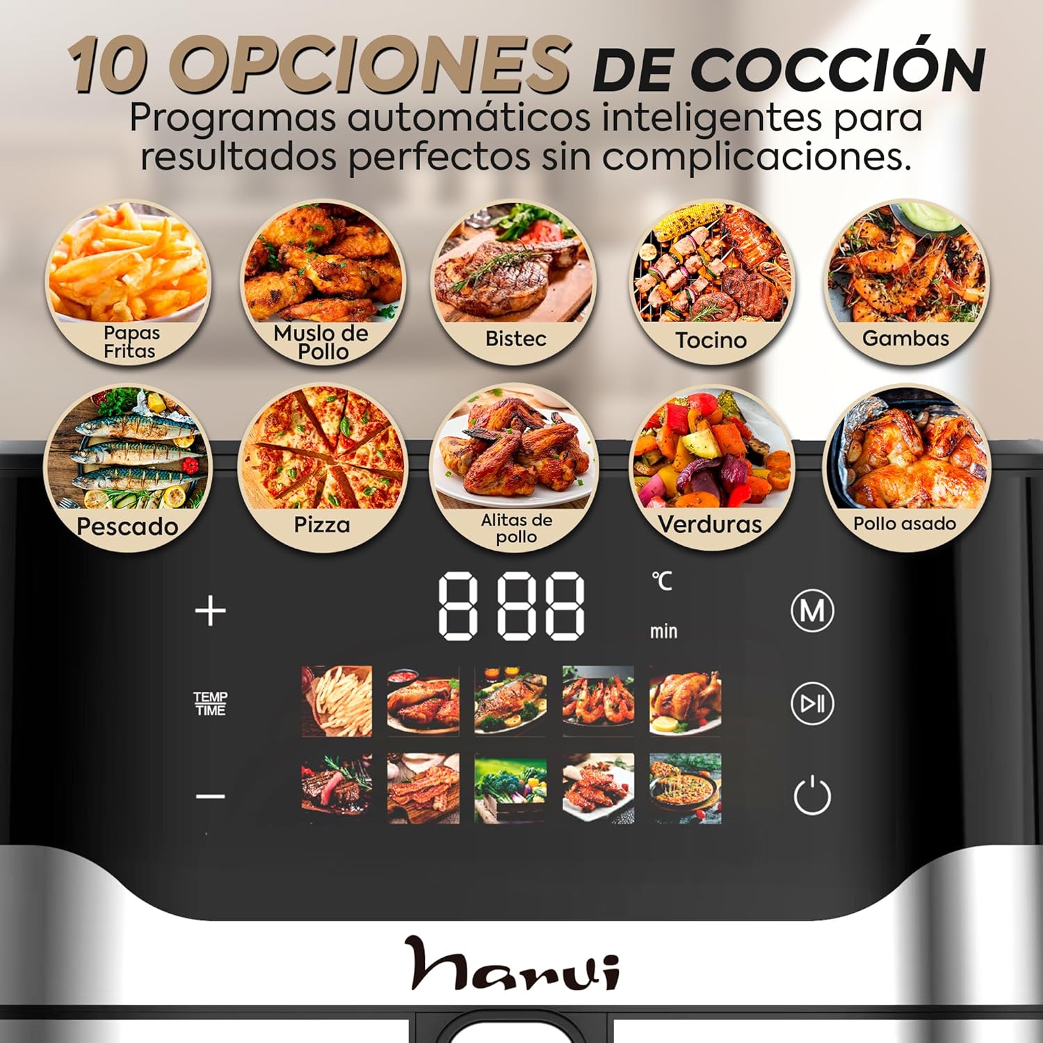 AIR FRYER DIGITAL CON 10 MENÚS AUTOMÁTICOS: Panel digital táctil intuitivo con 10 programas automáticos para patatas, pollo, carne, pescado, verduras y más. Cocina fácil, rápida y sin complicaciones.