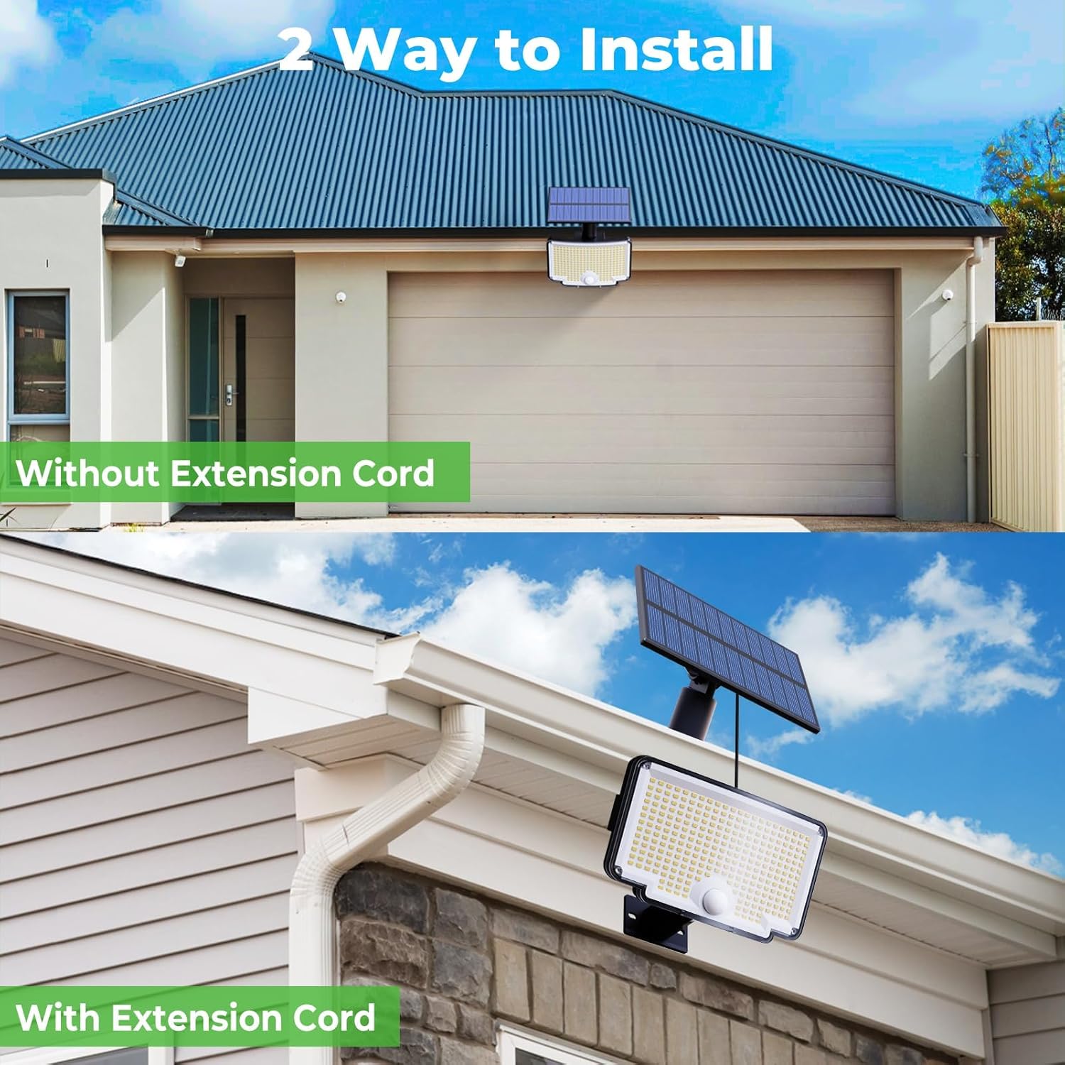 【Instalación más Flexible】: Esta focos solares para exterior de inundación cuenta con un diseño único y desmontable que separa el panel solar de la luminaria. Puedes colocar el panel solar en un lugar soleado, como la azotea, conectar la luminaria con un cable de 5 metros, y la lámpara luz solar exterior jardin instalada en el lugar donde se necesita iluminación, como el garaje,caminos,maximizar la absorción de energía solar