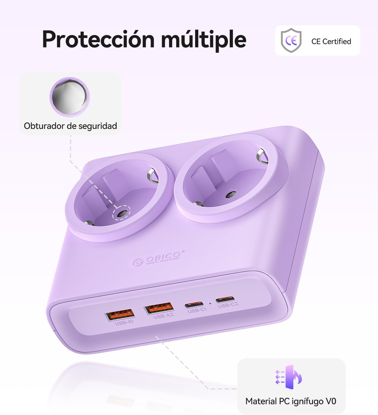 Se el primero en opinar sobre “ORICO Regleta Enchufes 6-en-1 PowerBrick Lila – 2 Tomas AC + 4 USB (2 USB-C PD), Carga Rápida 25W GAN, Cable 1,6m, 2500W MAX para Hogar, Oficina, Mesa(PDC)”