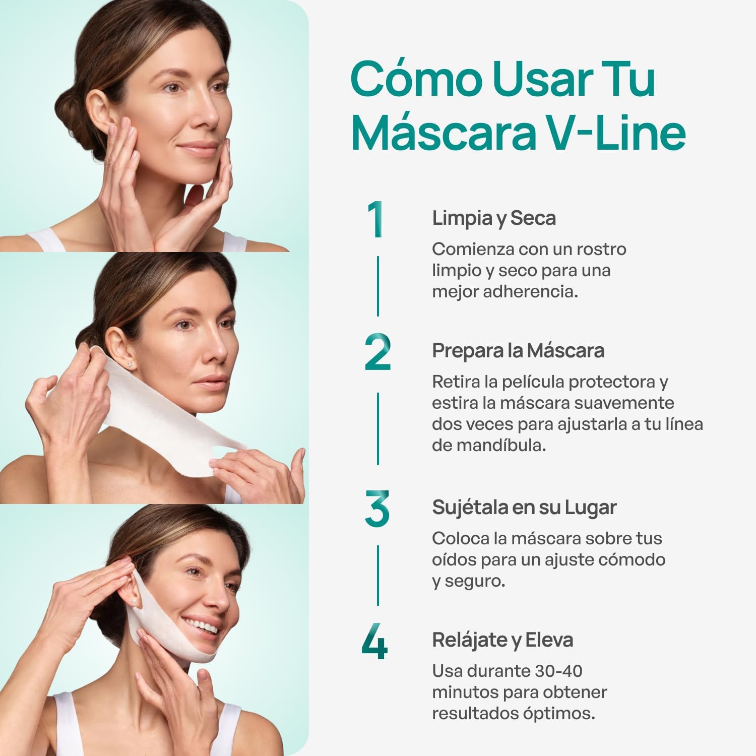 CÓMODA Y FÁCIL DE USAR: Con un material elástico, la mascarilla v-line se estira para ajustarse cómodamente alrededor de las orejas, haciéndola ideal para 30-40 minutos de uso diario durante tu rutina de cuidado de la piel