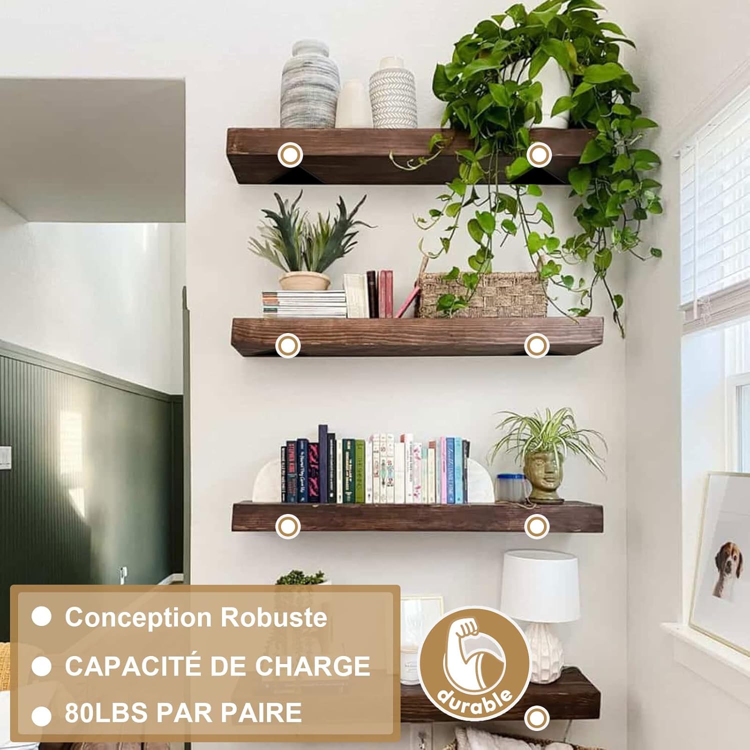 dice «Soporte de estante invisible». Tres estantes flotantes de madera oscura montados en una pared blanca que muestran libros, plantas y objetos decorativos. El pequeño recuadro circular muestra un detalle de soporte negrodice «Soporte de estante invisible». Tres estantes flotantes de madera oscura montados en una pared blanca que muestran libros, plantas y objetos decorativos. El pequeño recuadro circular muestra un detalle de soporte negro