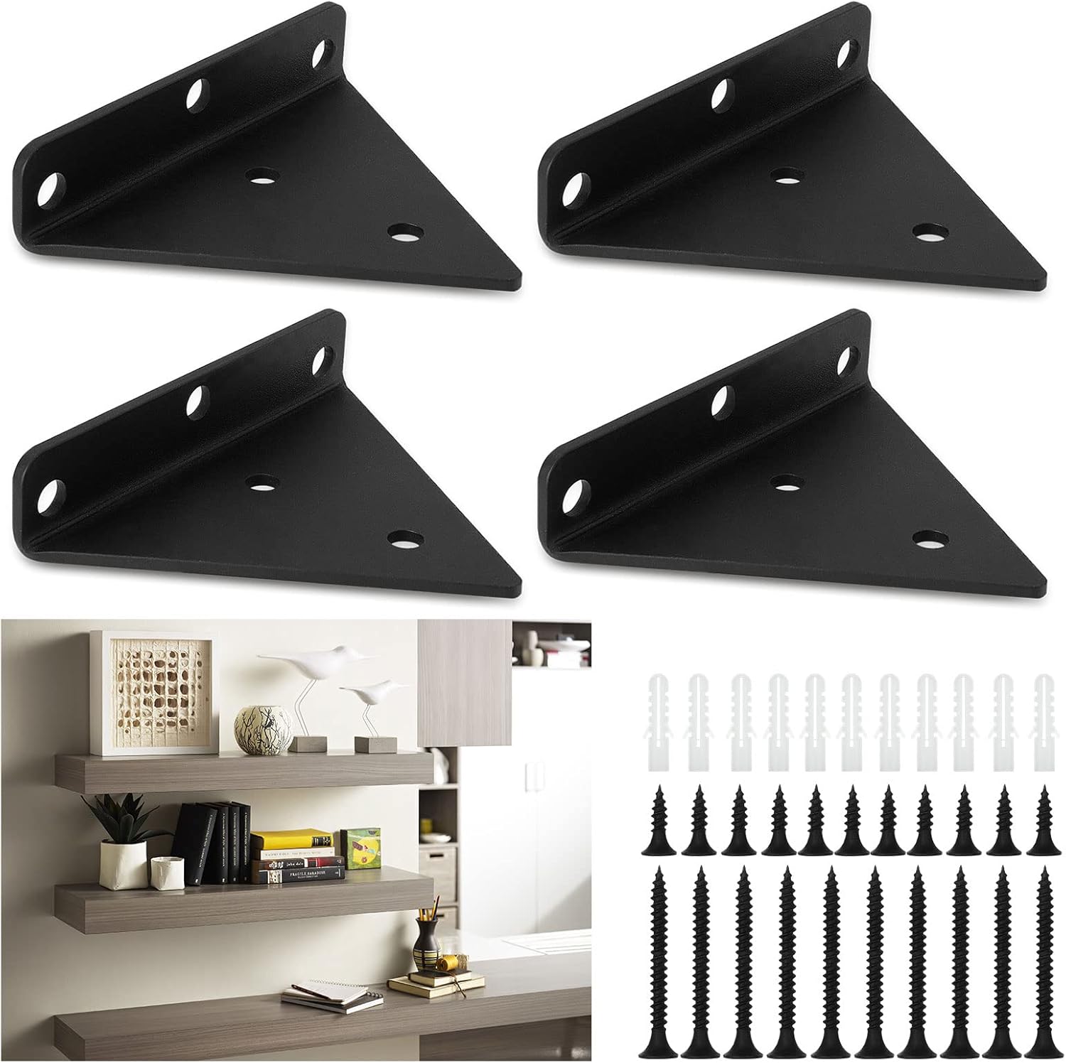 ✅【Qué recibirá】4 soportes ocultos negros para estantes de 8 cm, 8 tornillos largos, 8 tornillos cortos y 8 tacos para tablas de madera de 8-12cm de ancho, perfectos para montar en paredes de madera o cemento. Si desea utilizar el estante suspendido para cargas más pesadas o si el estante suspendido es demasiado largo, puede añadir soportes adicionales.
