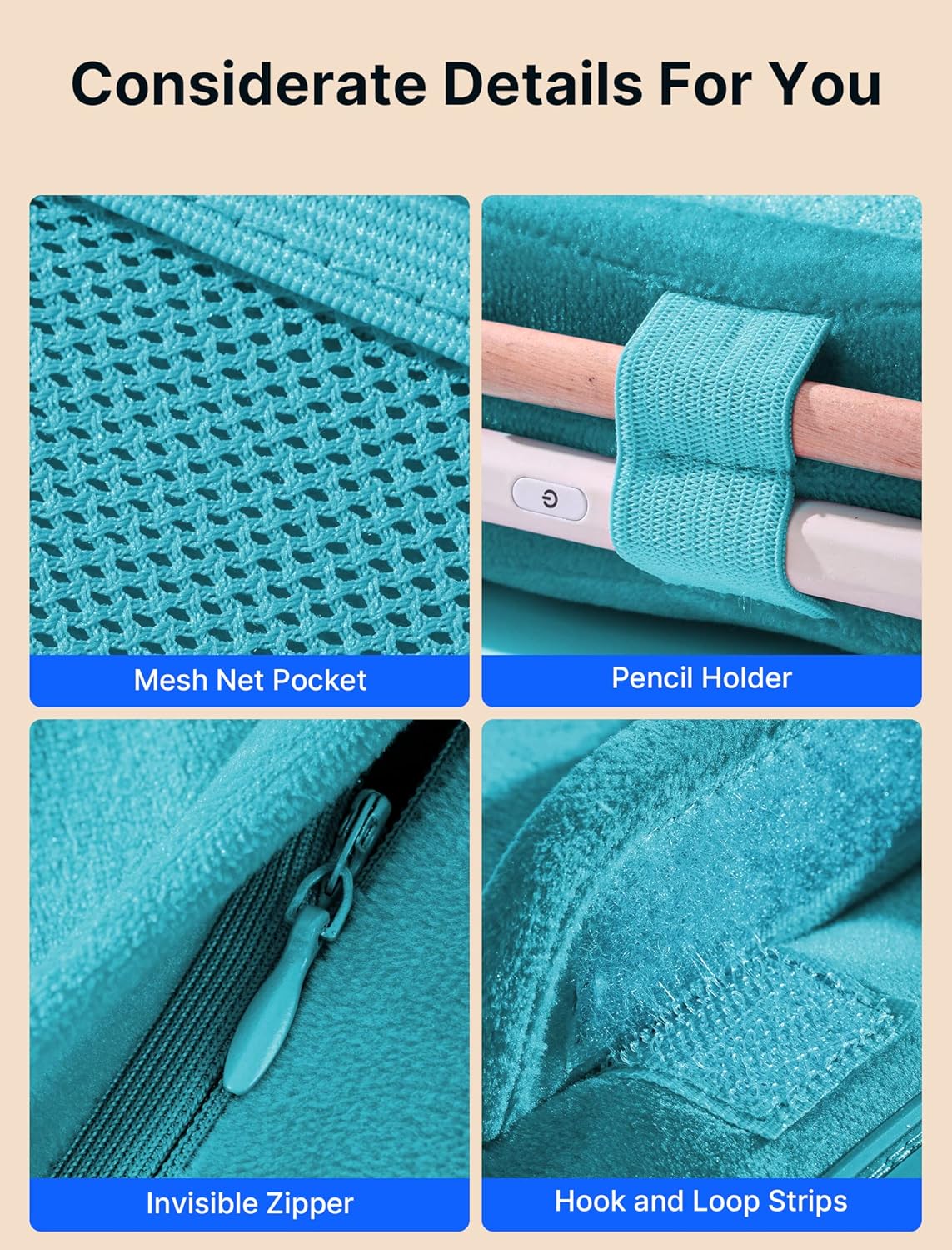 Detalles considerados La base para soporte de tableta JSAUX ofrece un diseño de detalles más considerados. El bolsillo de malla se puede utilizar para guardar el cable de carga y el cargador. El portalápices para el accesorio para lápices. Funda blanda extraíble y lavable con cremallera invisible.