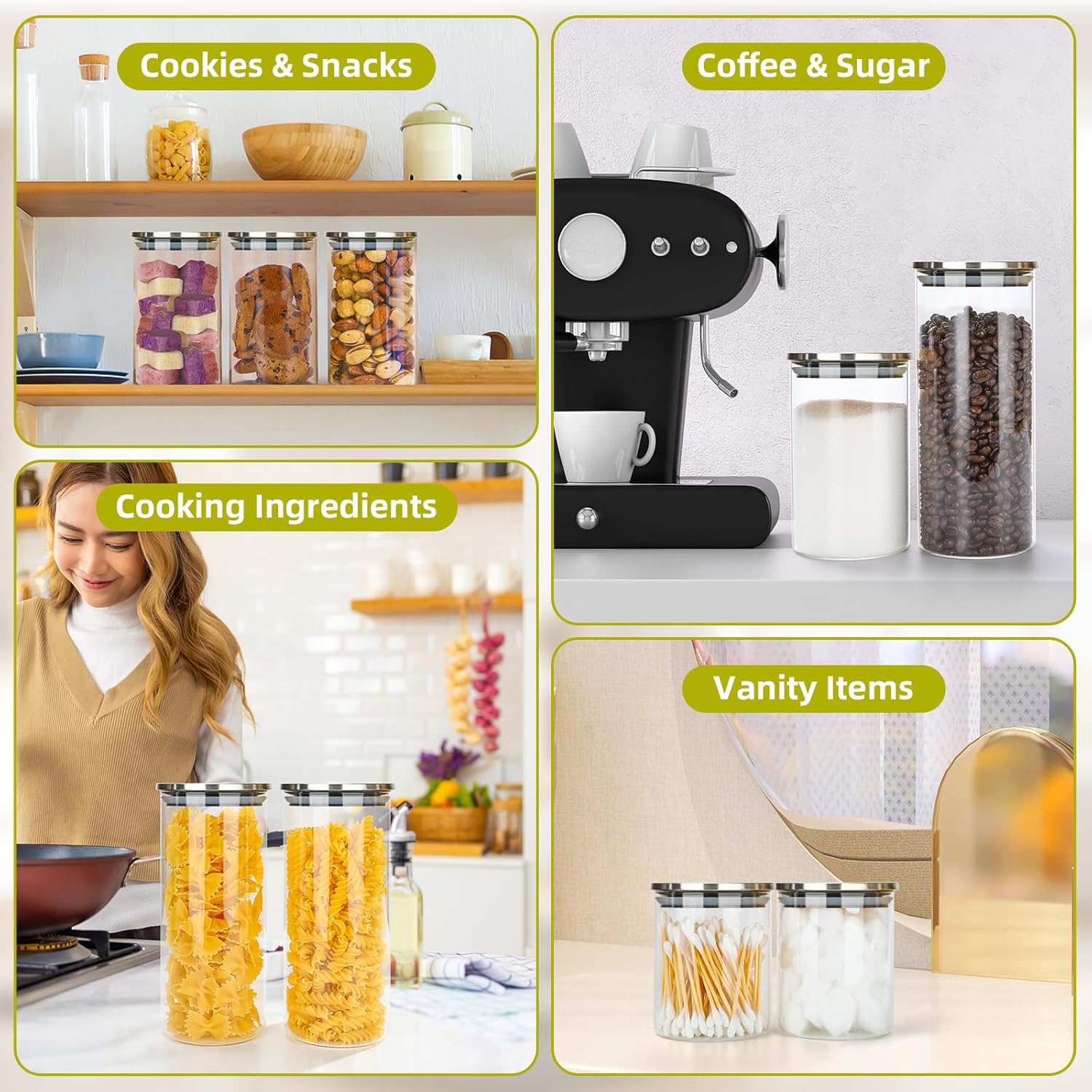 Los tarros de cristal con tapa pueden apilarse para ahorrar espacio cuando sea necesario, o colocarse en fila en su cocina o despensa.