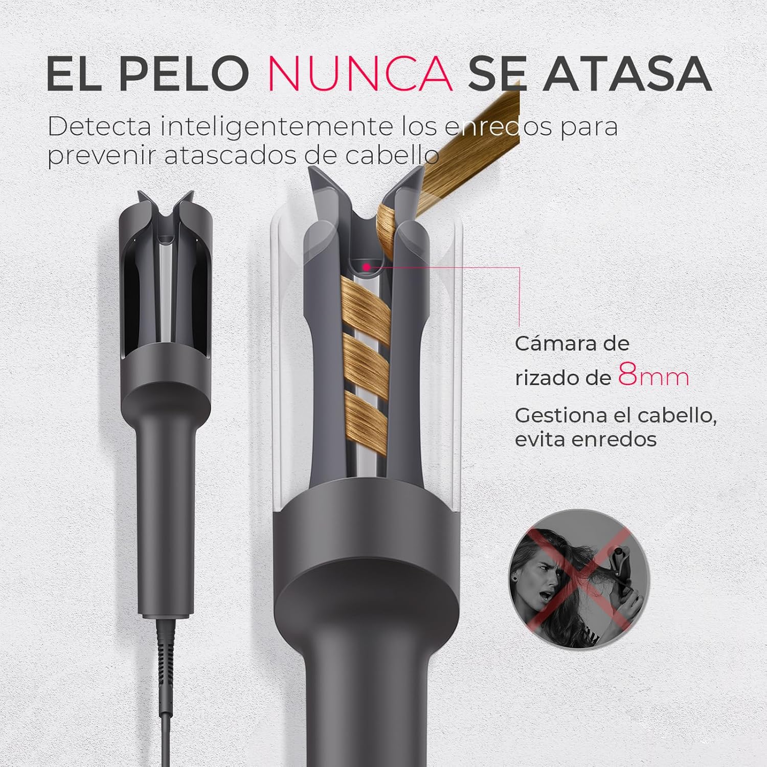 [Protección contra quemaduras y antienredos]: el tenacillas para rizar el pelo rotación automatico está diseñado con doble aislamiento térmico para proteger la cara y las manos de quemaduras. Su mecanismo inteligente antienredos detecta los mechones atascados y los libera inmediatamente, garantizando una experiencia de peinado suave.
