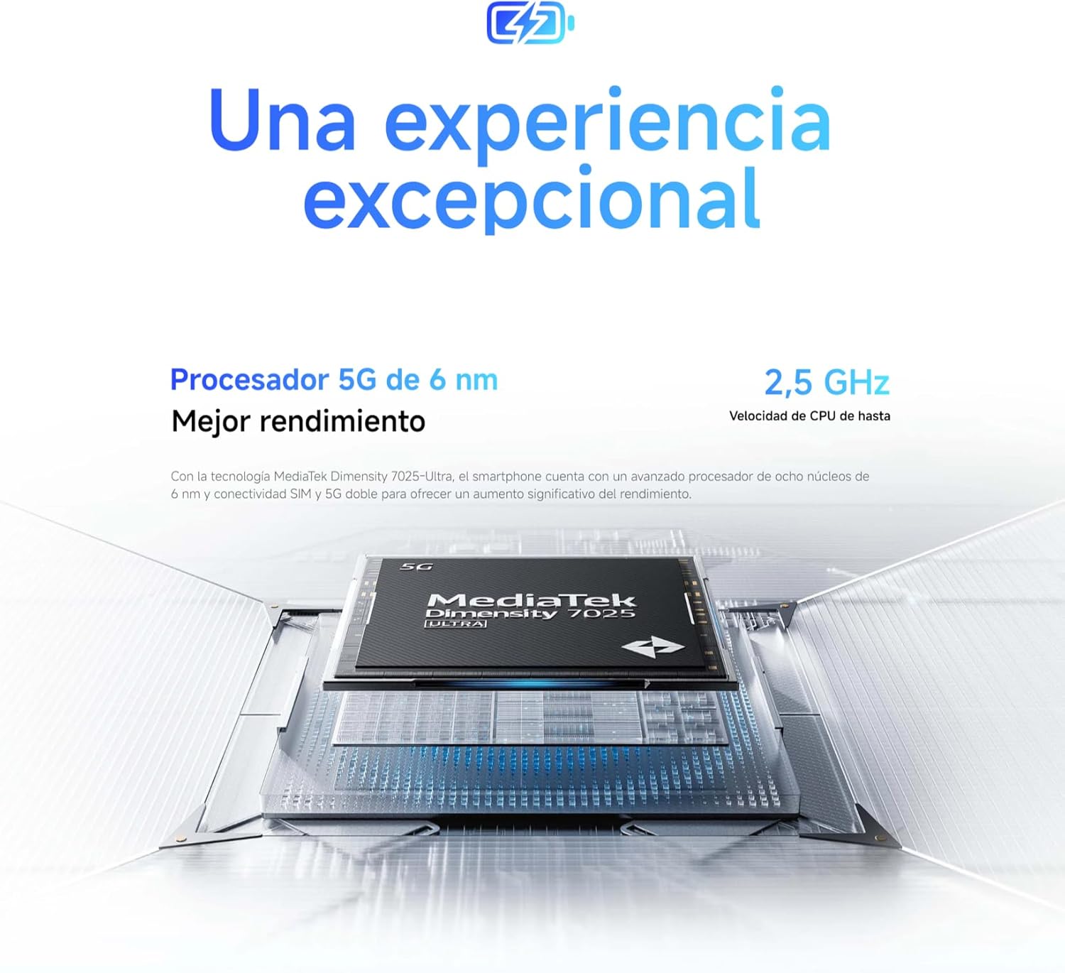Potencia y Eficiencia al Máximo. Impulsado por el procesador MediaTek Dimensity 7025-Ultra, el Redmi Note 14 5G combina potencia y eficiencia. Con un proceso de fabricación de 6 nm y hasta 8 núcleos (2 Cortex-A78 a 2,5 GHz y 6 Cortex-A55 a 2,0 GHz), este dispositivo está diseñado para manejar tareas exigentes, desde juegos hasta multitarea, sin esfuerzo